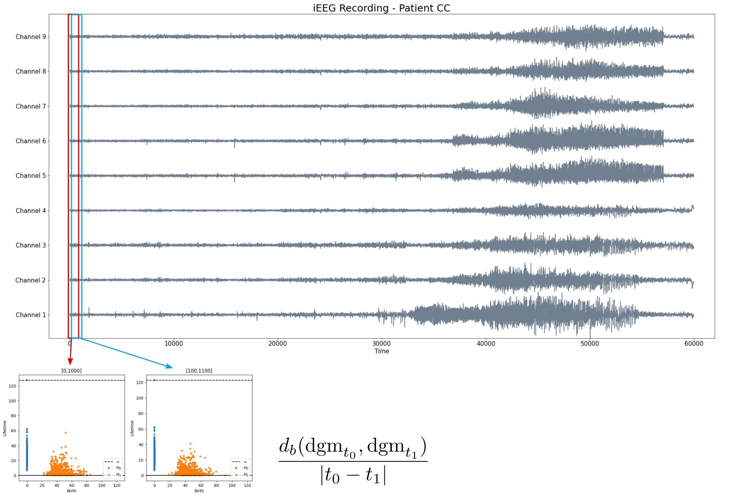 EEG $\to$ Sliding-window embedding $\to$ Camino de diagramas de persistencia $\to$ (Estimador de) primera derivada