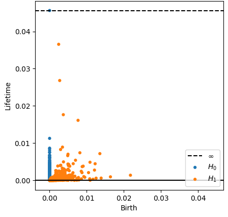 Firmas de persistencia locales: Para cada ventana normalizada $W_i$, calculamos la homología persistente del complejo cúbico filtrado asociado, para dimensiones 0 y 1. Codificamos los barcodes persistentes como una familia de curvas de Betti $\{\beta_{i,0}\}_{i=0}^{k}$ y $\{\beta_{i,1}\}_{i=0}^{k}$ para dimensiones 0 y 1, respectivamente.